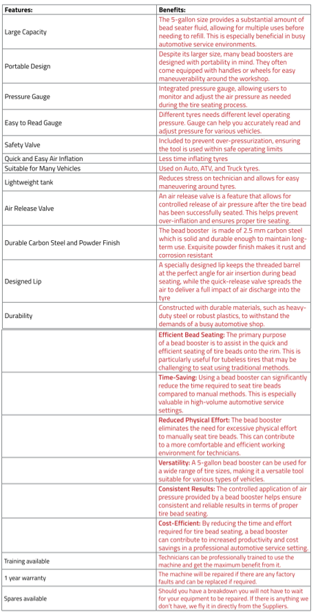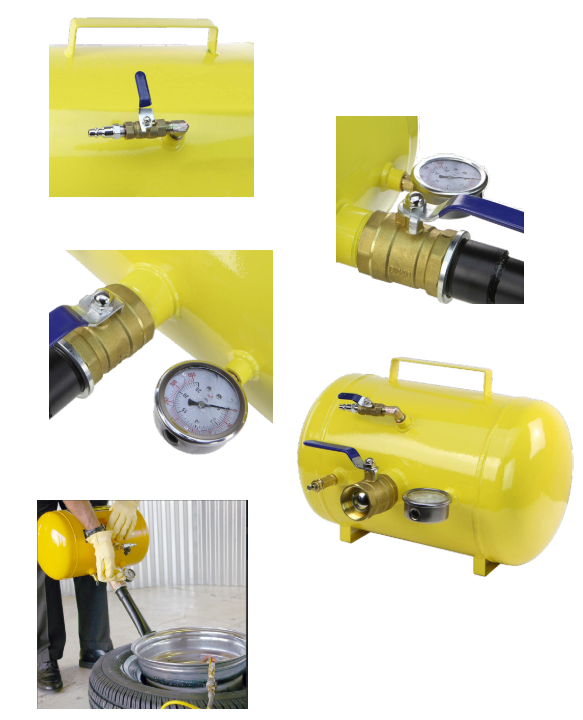 The BB-05 is designed to assist in the inflation of tubeless tyres by setting the bead with a quick release of air pressure. To use it efficiently, simply fill the tank to the necessary pressure and attach an air line to the valve stem of the wheel. Then aim the barrel between the tyre bead and wheel flange, and release the manual valve in order to allow a blast of air to set the bead. Used on Auto, ATV, and Truck tyres