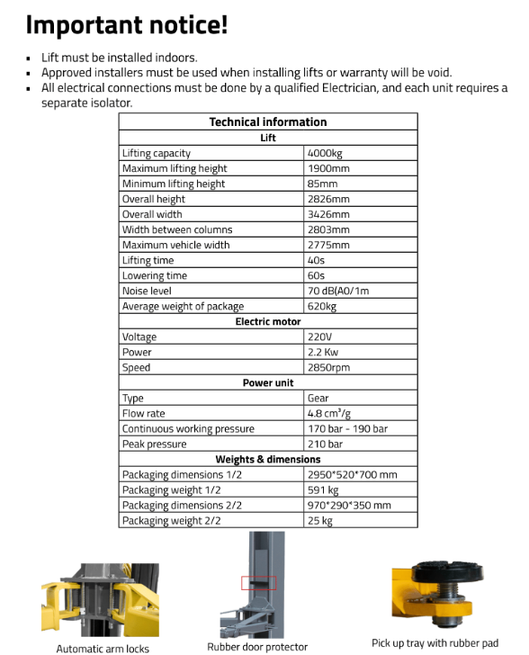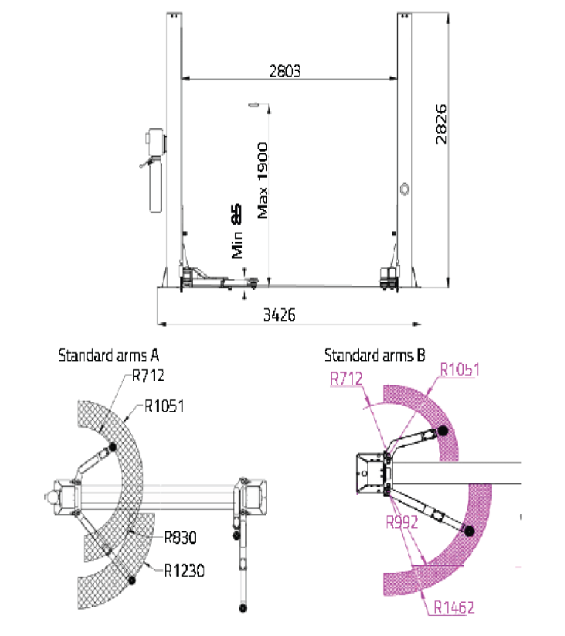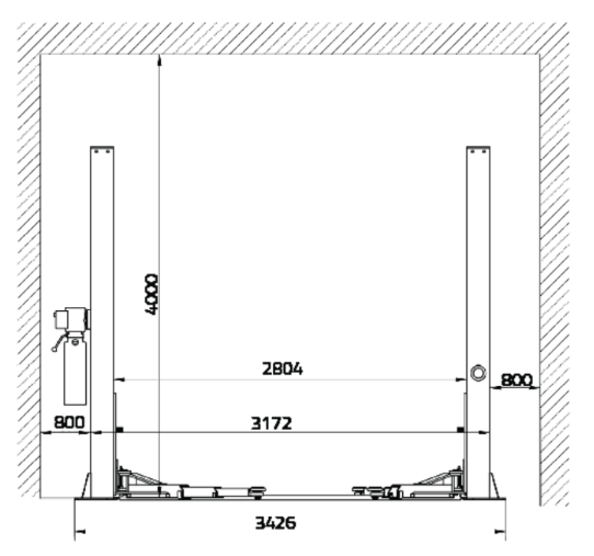 Centre plate between the 2 post to cover the hydraulic pipes and steel synchronizing ropes. Itis the most common type of lift, but the plate can be considered an obstruction when removing gear boxes on a transmission jack, however this lift is suitable for low ceiling workshops.
