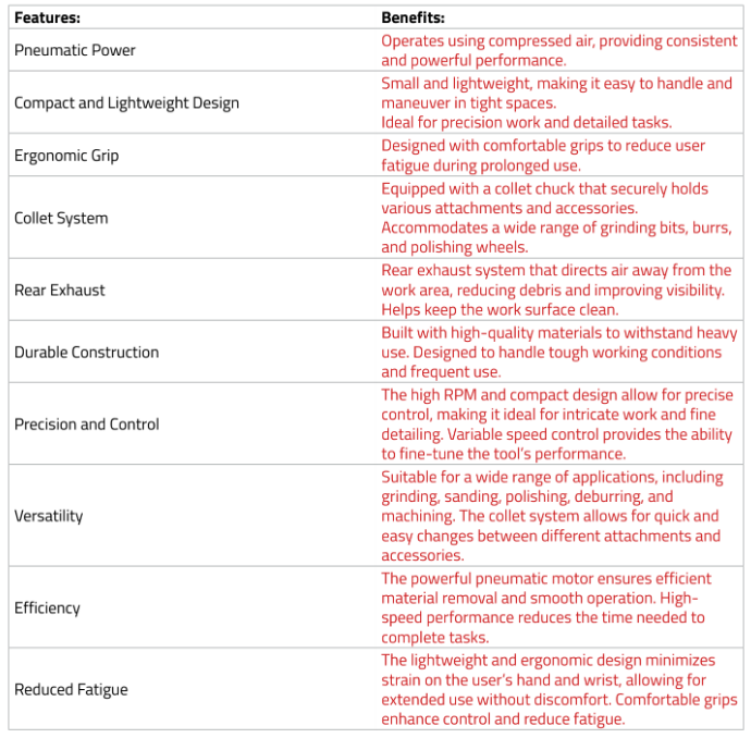 A mini air die grinder offers a combination of precision, versatility, and efficiency, making it an essential tool for professionals and hobbyists alike. Its ergonomic design, durability, and ease of use further enhance its value for a wide range of applications.