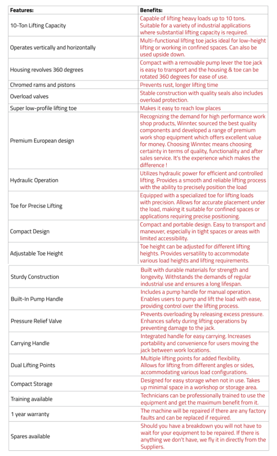 The Winntec 10T Toe Jack allows lifting of heavy machinery with minimum ground clearance. There are lifting points on both the toe and the jack’s top. Equipped with chromed ram and pistons. A 10-ton toe jack is a powerful and versatile tool for lifting and positioning heavy loads in industrial environments. As with any lifting equipment, users should adhere to safety guidelines and proper operating procedures to ensure a secure and efficient lifting operation.