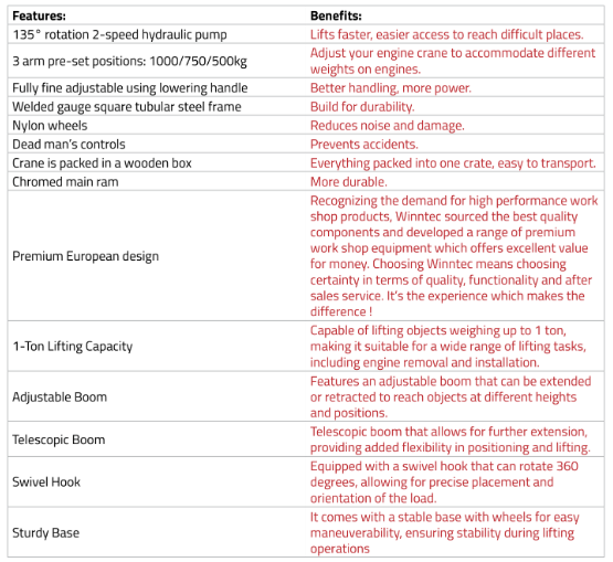 The Winntec Engine Crane is constructed from heavy gauge, welded square tubular steel. The2-speed hydraulic pump also rotates up to 135°, ensuring an optimal working position. Winntec are an established and respected manufacturer, developer and supplier of quality, efficient and extremely reliable garage equipment – suitable for a vast range of applications.