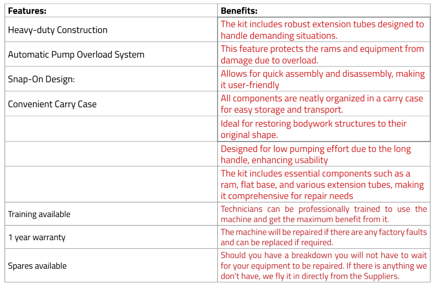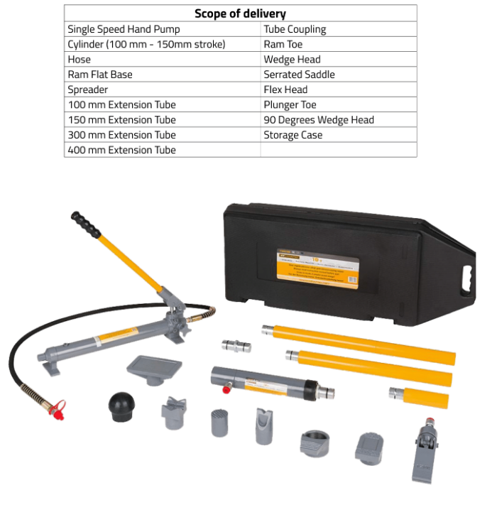 The Y444100 from Winntec is a 10-ton collision repair kit, commonly referred to as a “Porta Power.” This versatile toolset is designed for various applications in garages and workshops, enabling users to perform clamping, pulling, bending, straightening, spreading, and lifting tasks efficiently.