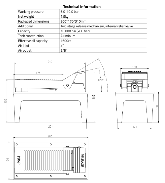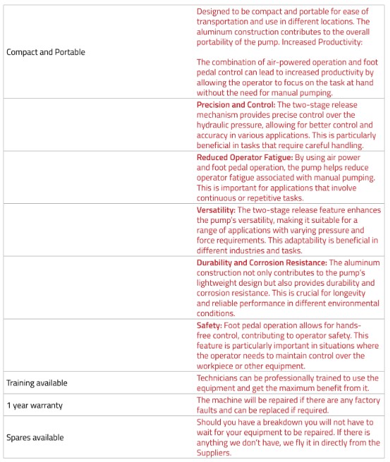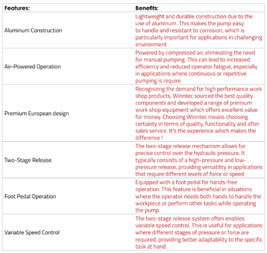The Winntec Air Hydraulic Pump is for use with a variety of rams, presses, and hydraulic tools operating up to 700 bar. It features a muffler for quiet operation and two-stage release mechanism. Winntec are an established and respected manufacturer, developer and supplier of quality, efficient and extremely reliable garage equipment – suitable for a vast range of applications.