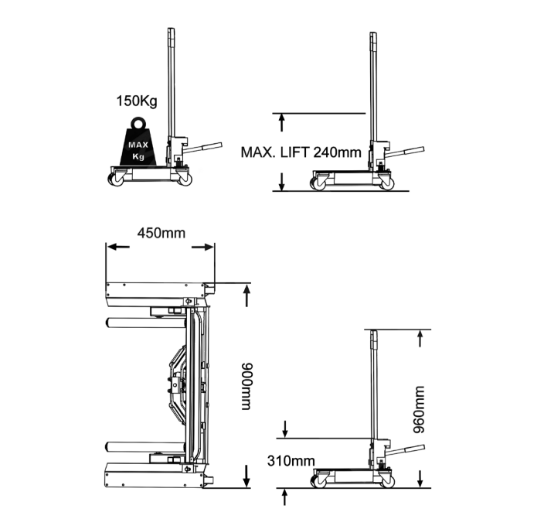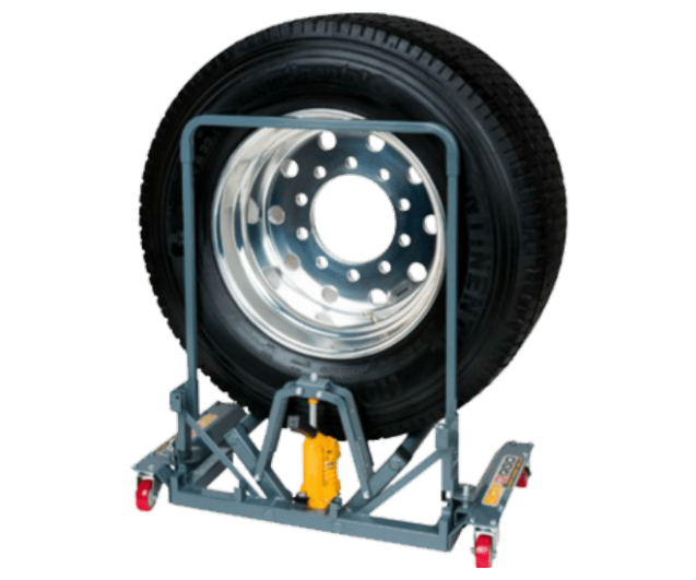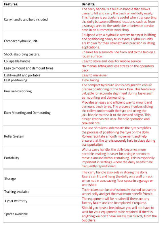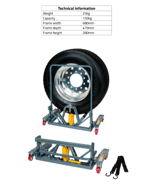 The wheel dolly has a compact hydraulic unit that ensures precise positioning. Shock absorbing casters ensure a smooth ride from and to the hub on a rough surface. Easiest way to mount &demount truck tyres. Simply slide the rollers underneath the tyre and use the jack handle to raise it to the desired height.