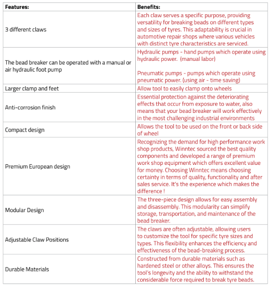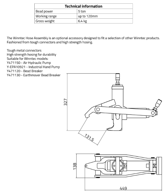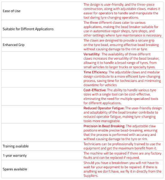 This heavy-duty self-retracting bead breaker works on all single, two and three-piece, 2-5-10hole bud wheels, 7.50X16s, and all tubeless truck tyres/rims, including new designs. The Bead is broken using 5 Tons of force with a working range of up to 130 mm. Works on most single, two, and three-piece tyres/rims. (The Y471120 can be used to detach the inside and outside tyre bead of all types of tyres trucks, combine-harvesters and tractors.