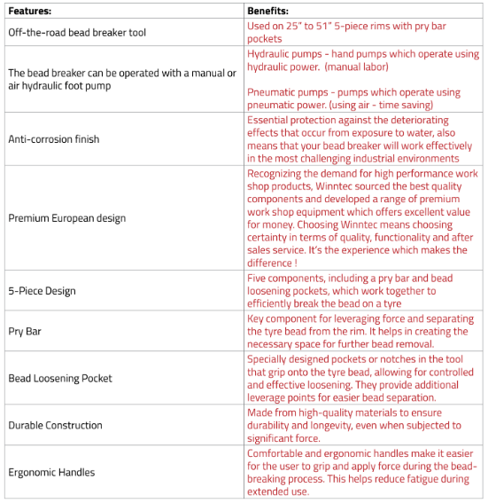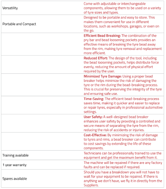 The 5pc bead breaker is designed for use on 5 piece rims of 25” – 51” size. The bead breaker operates on the front (outer) flange of the rim by engaging with the bead loosening pockets and hydraulically pushing the front flange and tyre bead away from the bead seat band. It is designed to break earth mover tyre beads on rusted rims.